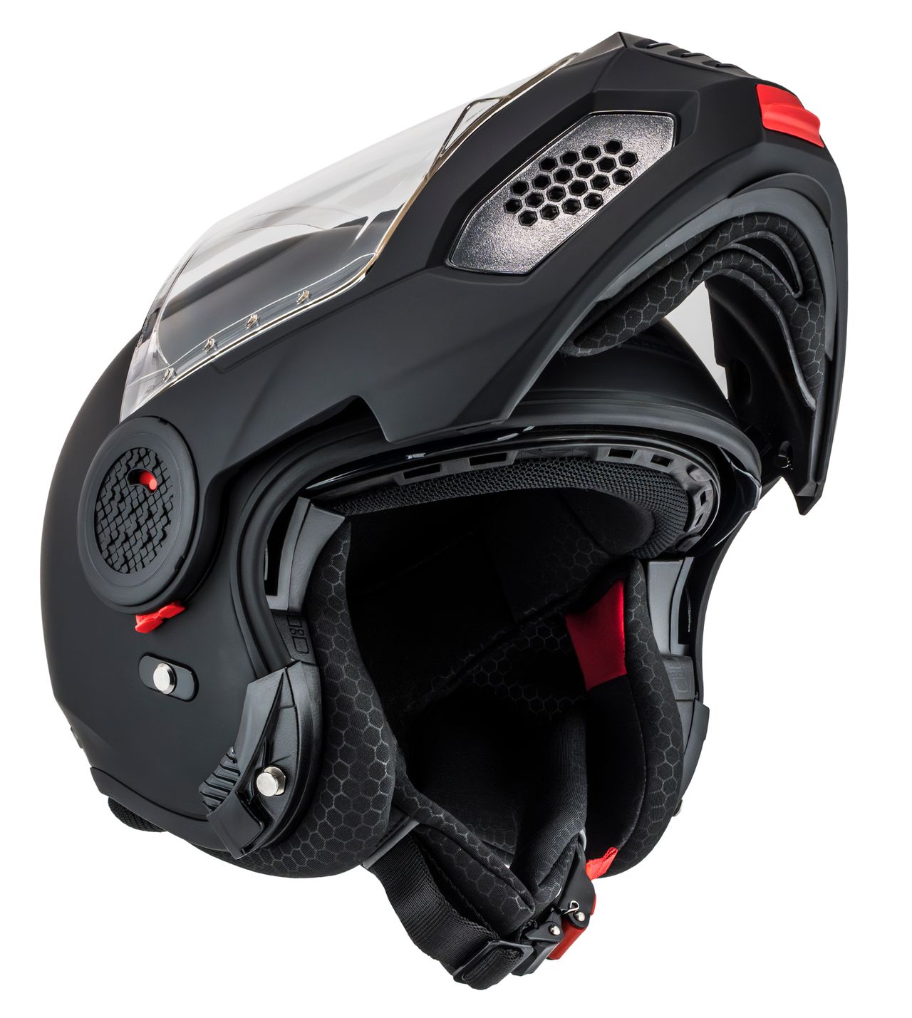 Med et enkelt tryk på en knap fældes hagepartiet op, hvilket giver bedre ventilation og fleksibilitet ved stop eller rolig bykørsel.