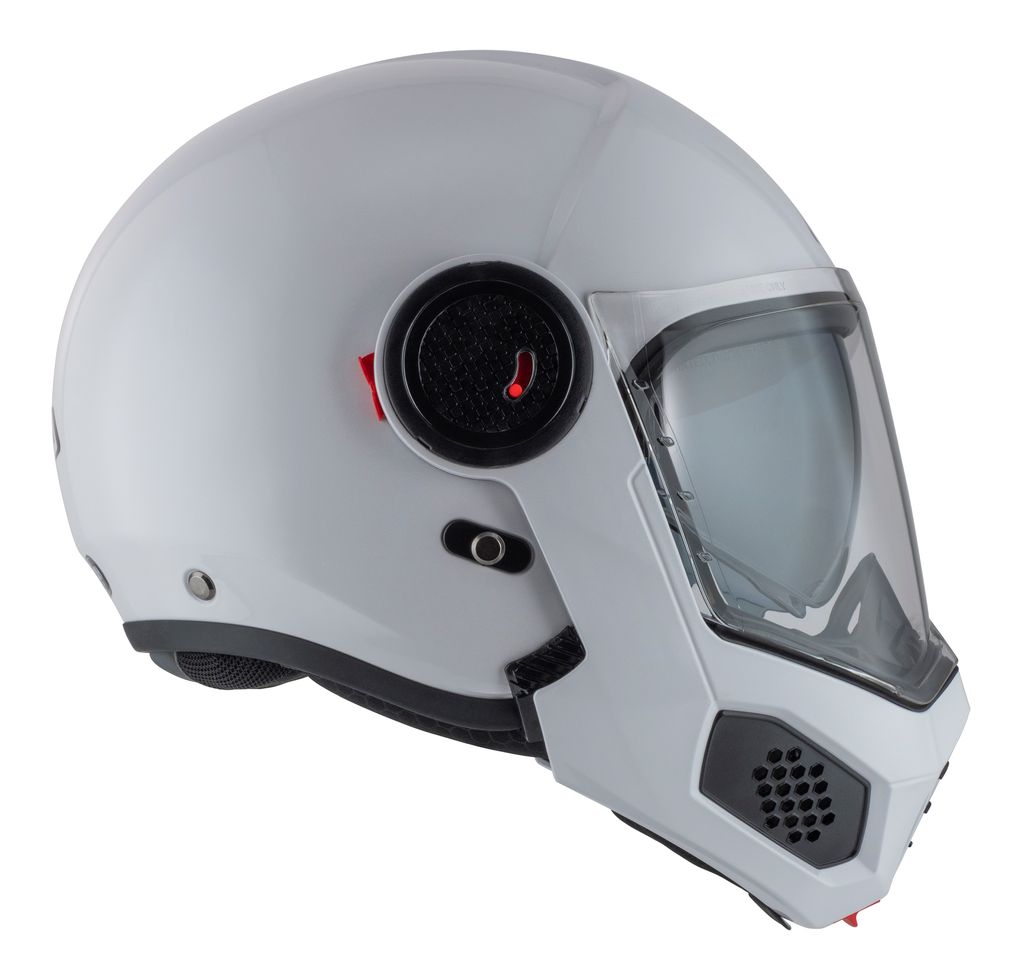 Med et enkelt tryk på en knap fældes hagepartiet op, hvilket giver bedre ventilation og fleksibilitet ved stop eller rolig bykørsel.