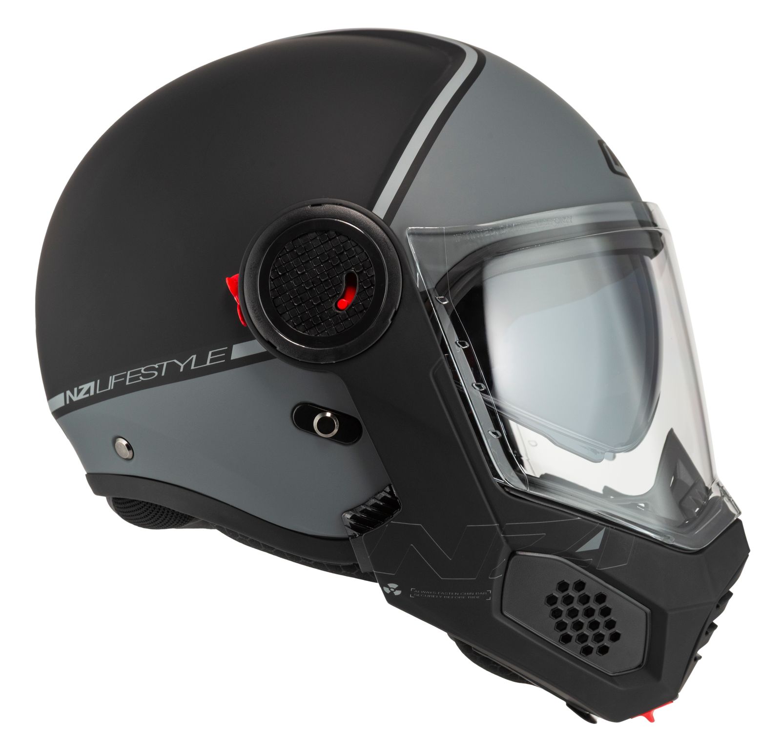 Med et enkelt tryk på en knap fældes hagepartiet op, hvilket giver bedre ventilation og fleksibilitet ved stop eller rolig bykørsel.