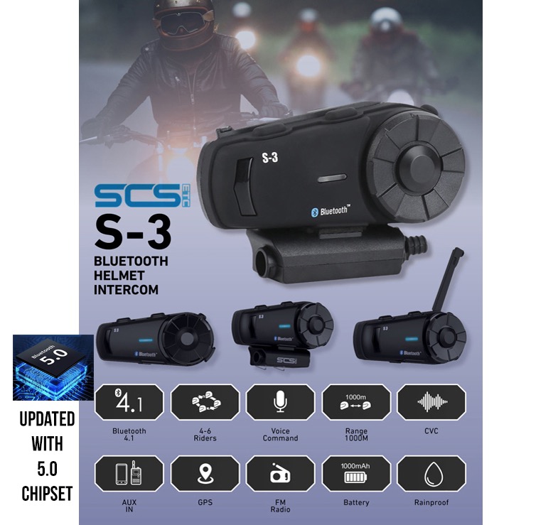 Denna modell har även FM radio. Räckvidden är dessutom upp till 1000 meter. På youtube hittar du en sjö av olika videos där man testat enheten med att koppla till andra bluetooth enheter samt ljud och gruppkoppling. Med enkel installation så gäller det bara att gå ut och köra. SCS S3 levererar ljud i bra kvalitét som gör att förare och passagerare kan samtala, lyssna på musik via telefonen eller även få röstnavigering från GPS. Med aktiv brus reducering så att det inte stör ut eller inkommande ljud. Ett måste för som vill ha det lite bättre i trafiken. Enheten är specialutvecklat för motorcykelkörning och du kan prata med upp till 6 användare på ett avstånd på upp till 1000m.
