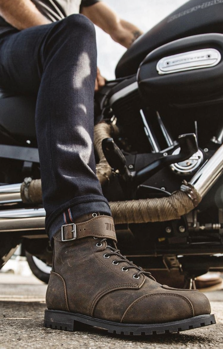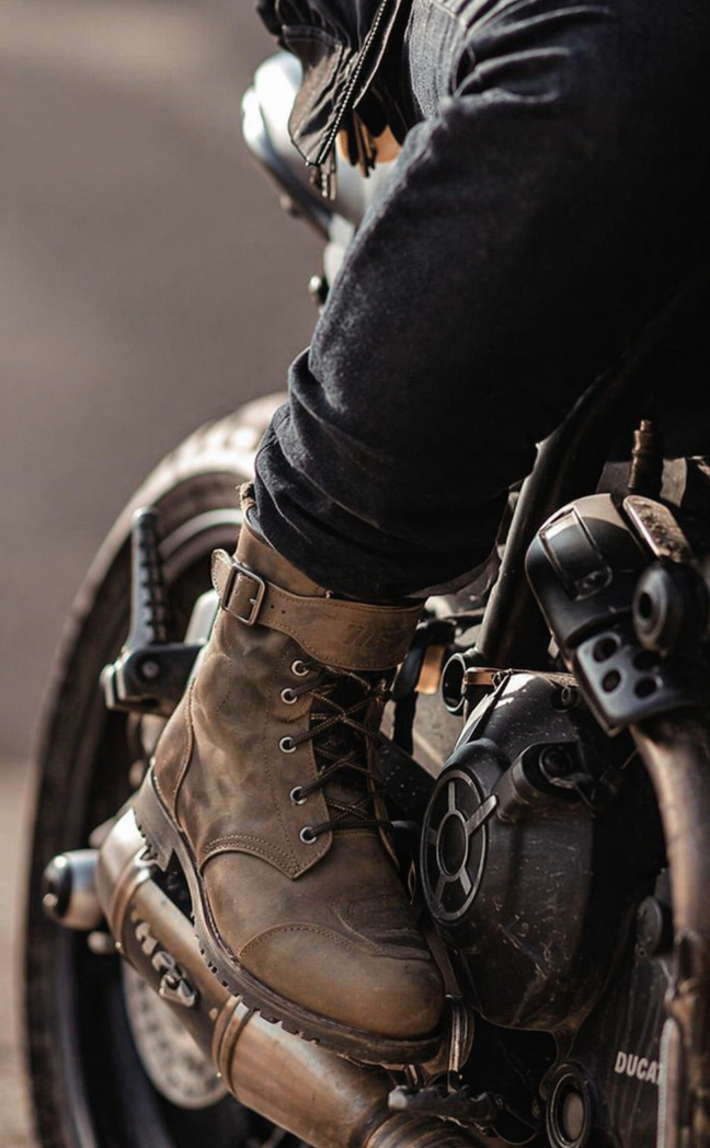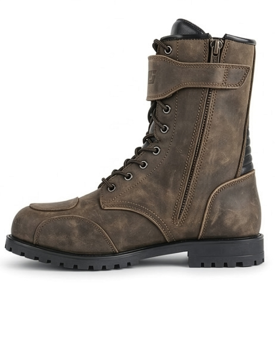 En robust og stilren MC-støvle i ægte skind med et klassisk vintage-look, der kombinerer tidløst design med moderne sikkerhed. Den slidte brune finish giver et råt og autentisk udtryk, samtidig med at støvlen er udviklet til at opfylde kravene fra nutidens motorcyklister.